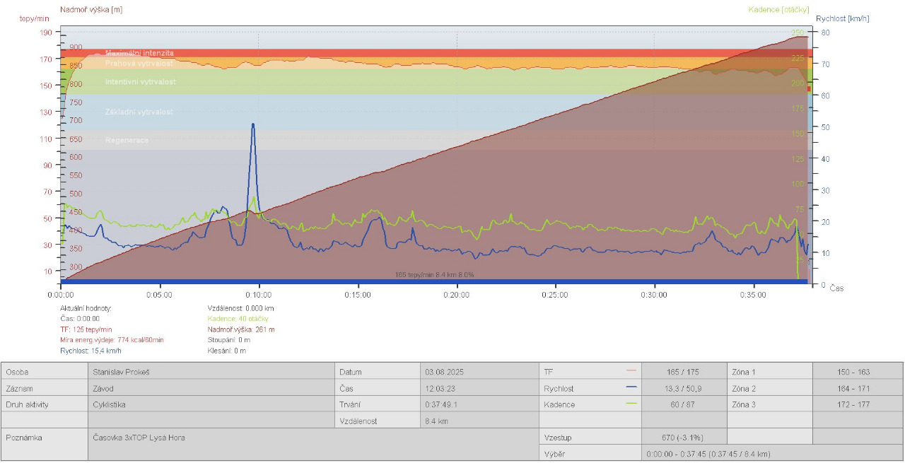 Dalším závodem byla 3.8. tradiční časovka na Lysou Horu. Letos opět na mokru, ale přes počáteční nejistotu, jsem ji ve finále odjel. Jen jsem se po převlečení v cíli moc nahoře nezdržoval a sjel zase rychle zpátky do tepla. Ten den jsem se na kopci dost vytrápil a i ze záznamu Polaru je vidět, že mě to ten den moc nesedlo a i čas nebyl nic moc. Přesto stačil na šesté místo v kategorii.