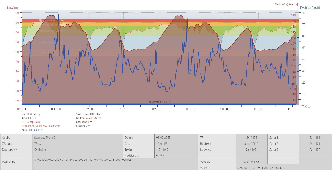 Následujícím závodem byla šestého září moje oblíbená Mokrolazecká 60. Selektivita úvodního stoupání na Hrabyni způsobila, že jsem po prvním kole zůstal sám s Milanem Novákem za zády. Takto jsem obkroužil zbývající dvě kola a potěšilo mě, že jsem přesto dokázal udržet dostatečné tempo a nikdo mě zezadu nesjel. Můj čas stačil na páté místo v kategorii.