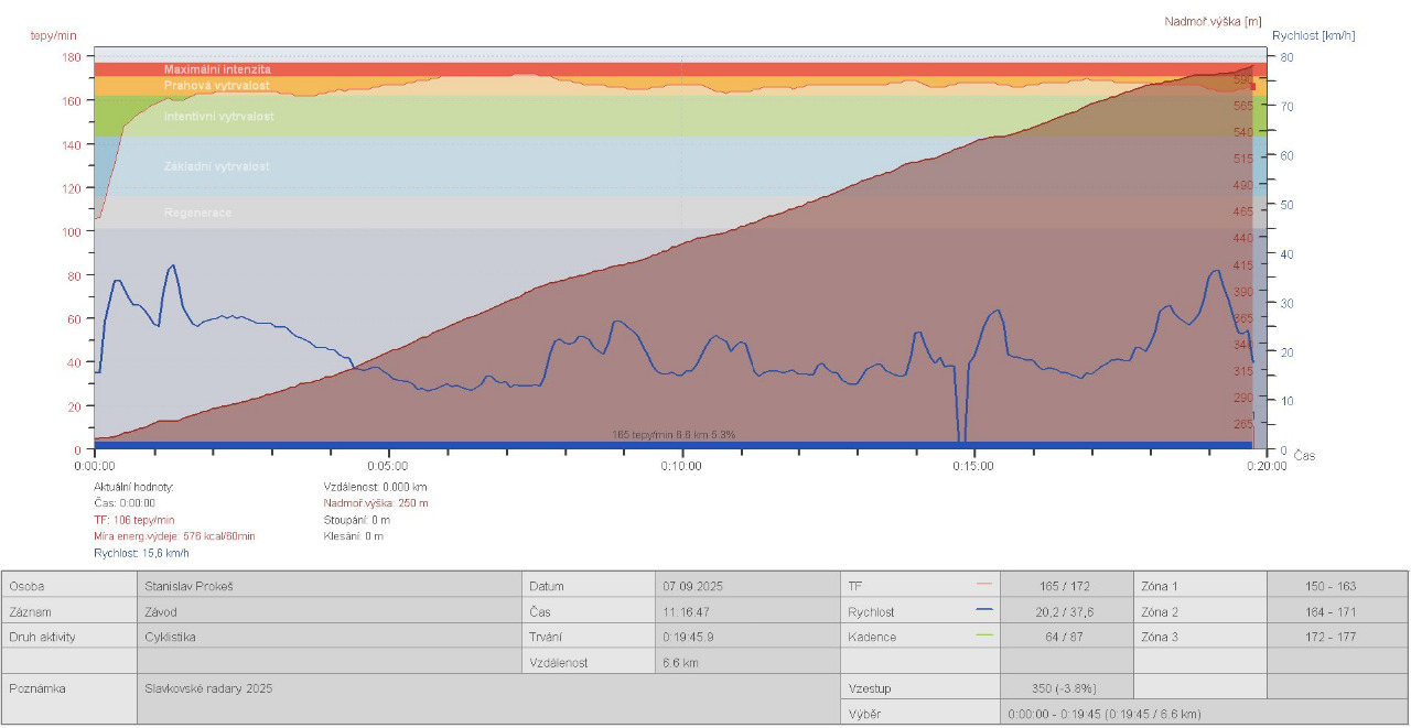 Na druhý den se v Loučce jela tradiční časovka Slavkovské radary. Na závodě jsem už několik let absentoval, dobrý důvod zase si k radarům na čas vyjet. Ten den moc teplo nebylo, ale aspoň nepršelo. Můj čas sice nebyl nic moc, ale zajel jsem lehce pod dvacet minut, což považuji za velmi dobrý výkon. Také mě potešilo, že se závod vrátil k původnímu formátu a podle počtu účastníků si své příznivce udržel. Za mě velký palec nahoru!