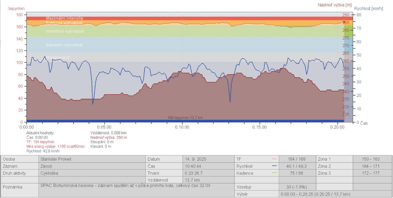 Předposledním závodem byla 14. září propršená Bohumínská časovka. Závod jsem absolvoval celý v dešti, až na vyhlášení se maličko vyčasilo. Paradoxně jsem s časem, který opět nebyl nic moc, zajel nejlepší výsledek sezóny. V kategorii jsem skončil na čtvrtém místě. Jelikož se ale závod jel jako Mistrák SPAC, v redukovaném pořadí jsem v rámci SPAC obsadil v kategorii třetí místo a šel jsem si na bednu pro placku.