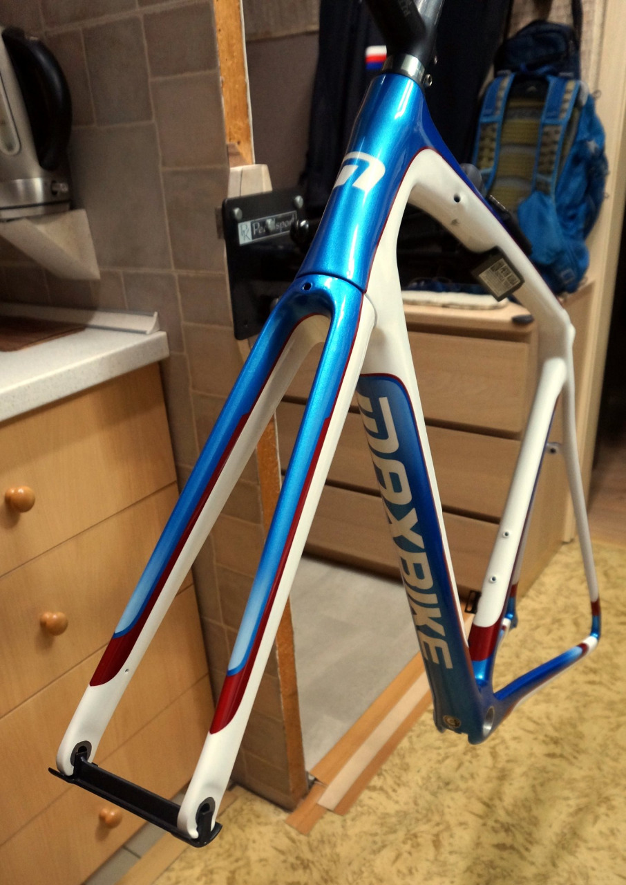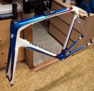 Ještě se musím pochlubit pro mě příjemnou zprávou. Podařilo se mě konečně posunout přípravu nové závodní silničky. Rám Maxbike CRF8800 jsem pořídil sice už v roce 2023, ale byl holý bez laku. Chtěl jsem na něj pěkný originální lak a tak jsem o něj požádal pana Marka (Cyklolakovna Frýdek-Místek). Když už jsme měli grafický návrh připravený, hodila mě do plánů vidle moje nemoc a tak jsem si pro hotový lak jel do Frýdku až loni v listopadu. Na přiložených fotkách můžete posoudit výsledek. Lak je moc pěkný, ale při umělém osvětlení to moc není vidět. Myslím, že to nejlépe vyzní až na hotovém kole a za denního světla.