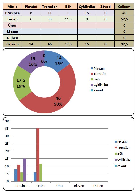 V přiložené tabulce uvádím statistiku tréninku za prosinec a leden. Co se týče objemu tréninku, vypadá to dobře, otázkou je, jak se na mé výkonnosti projeví ten roční výpadek. To se však dozvím až v květnu na prvních závodech.